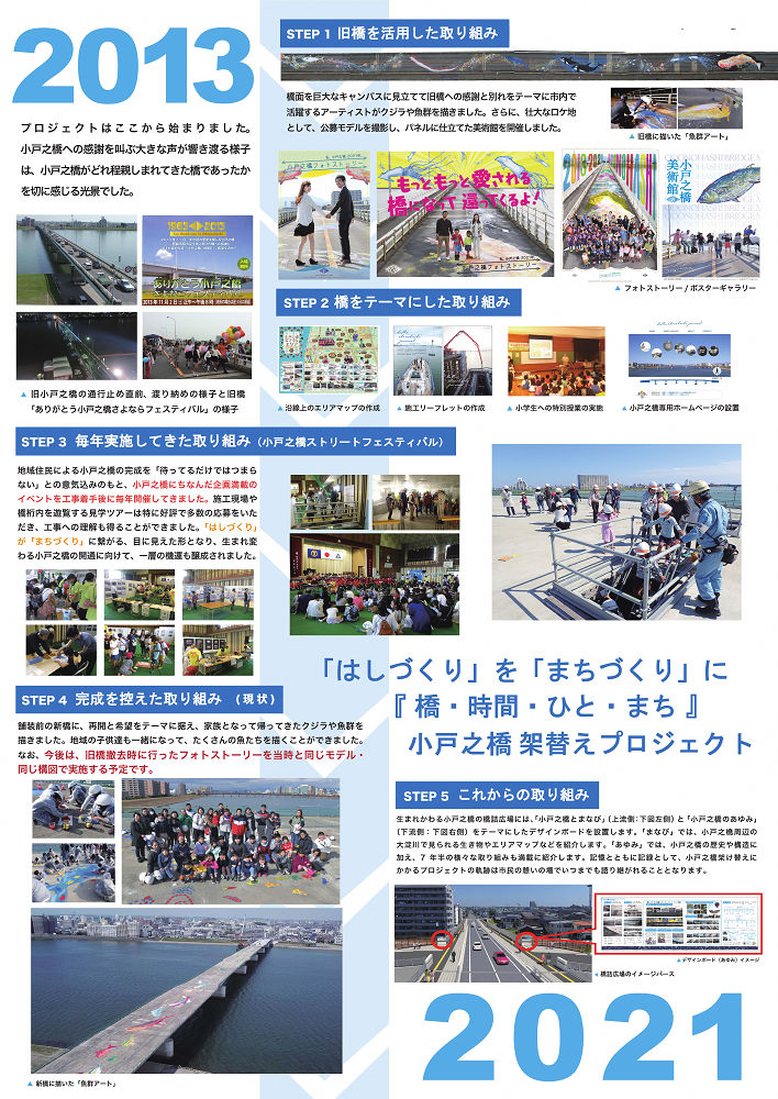 【事業内容】 その他 【具体内容】 ・「はしづくり」を「まちづくりに」の理念のもと、特に地域活性化に向けた取り組みとして、施工中の小戸之橋をメインに据えた新橋完成までのカウントダウンイベントとなる「小戸之橋ストリートフェスティバル」を毎年地域主体で開催した。 ・橋上を巨大なキャンパスに見立て、クジラや魚群を描く「小戸之橋魚群アート」や、橋上をロケ地に見立てた小戸之橋「フォトストーリー」を旧橋撤去から新橋設置までのタイムワープ企画としてそれぞれ実施した。 ・新橋完成後の橋上で、旧橋撤去当時と同モデル、同構図でフォトストーリーを実施した。その他、専用ホームページの開設等を行った。 【制度活用】