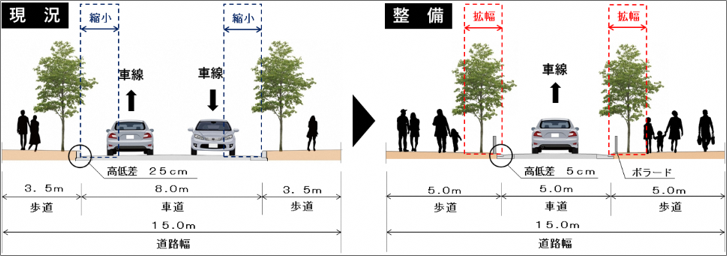 【事業内容】 再構築(ハード施策) 【具体内容】 ・車線を減らした ・道路空間を再配分し、歩行者優先の道路へと転換するための整備を実施 ・歩道を拡幅(3.5m→5m)するため、車道幅員を縮小(8m→5m) ・老朽化した道路施設を、景観性に配慮した施設へ更新 【制度活用】 ・まちなかウォーカブル推進事業(社交金) 【事業内容】 再構築(ソフト施策) 【具体内容】 ・一方通行化した ・交通規制を相互通行から一方通行へ変更し、車線数を削減(2車線→1車線) ・事前に規制変更などの影響について、社会実験により検証 【制度活用】 なし 【事業内容】 利活用 【具体内容】 ・路上に可動式のイスやテーブル、ソファ等を設置 ・路上に屋台やキッチンカーを設置 ・非定期的にイベントを開催 ・車両通行止めにした利活用として、マルシェや子ども向けワークショップなどのイベント実施 ・車両通行止めを伴わない利活用として、歩道へのベンチ設置、キッチンカーなどによる飲食販売を1か月間実施 【制度活用】 ・通常の道路占用・使用