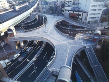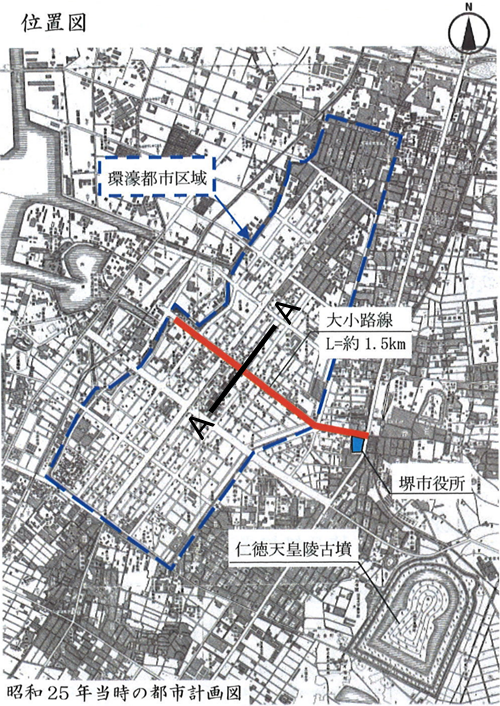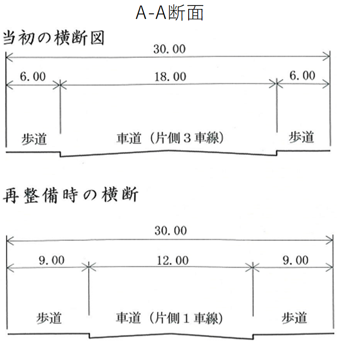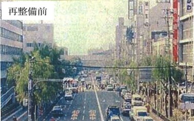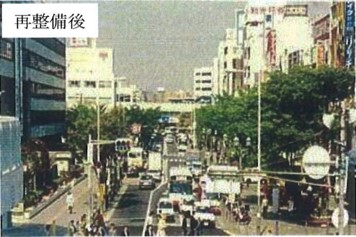 【事業内容】 再構築(ハード施策) 【具体内容】 ・車線を減らした ・片側3車線を片側1車線に再整備し、歩道の拡幅、壁面モニュメントや噴水の整備、共同溝による電線の地中化、歩道橋の架け替えなどを実施した。 【制度活用】
